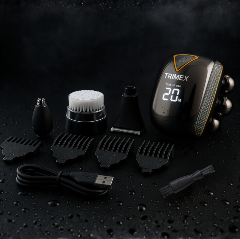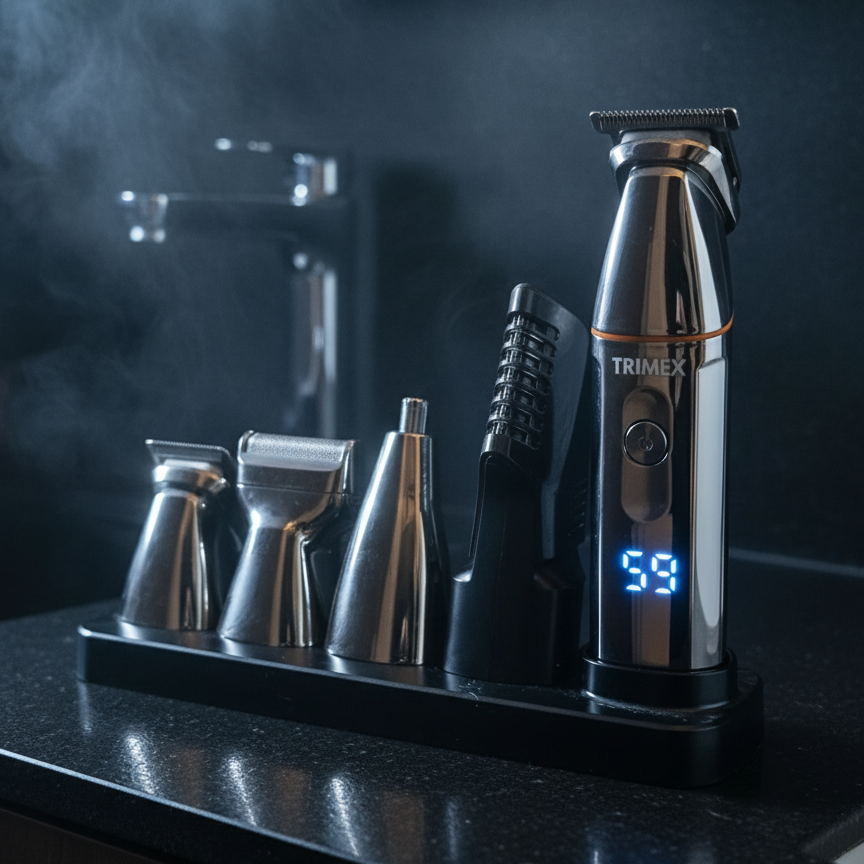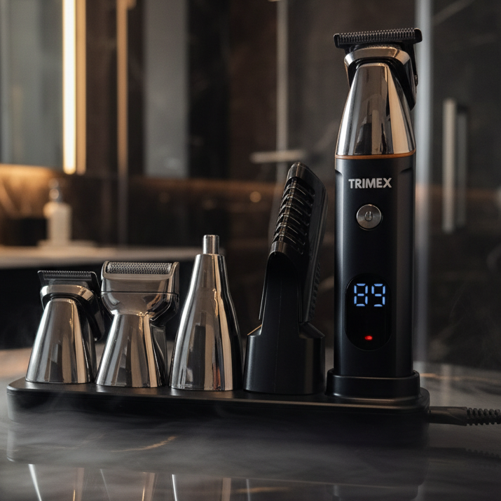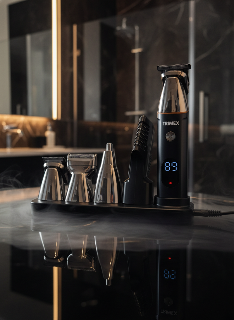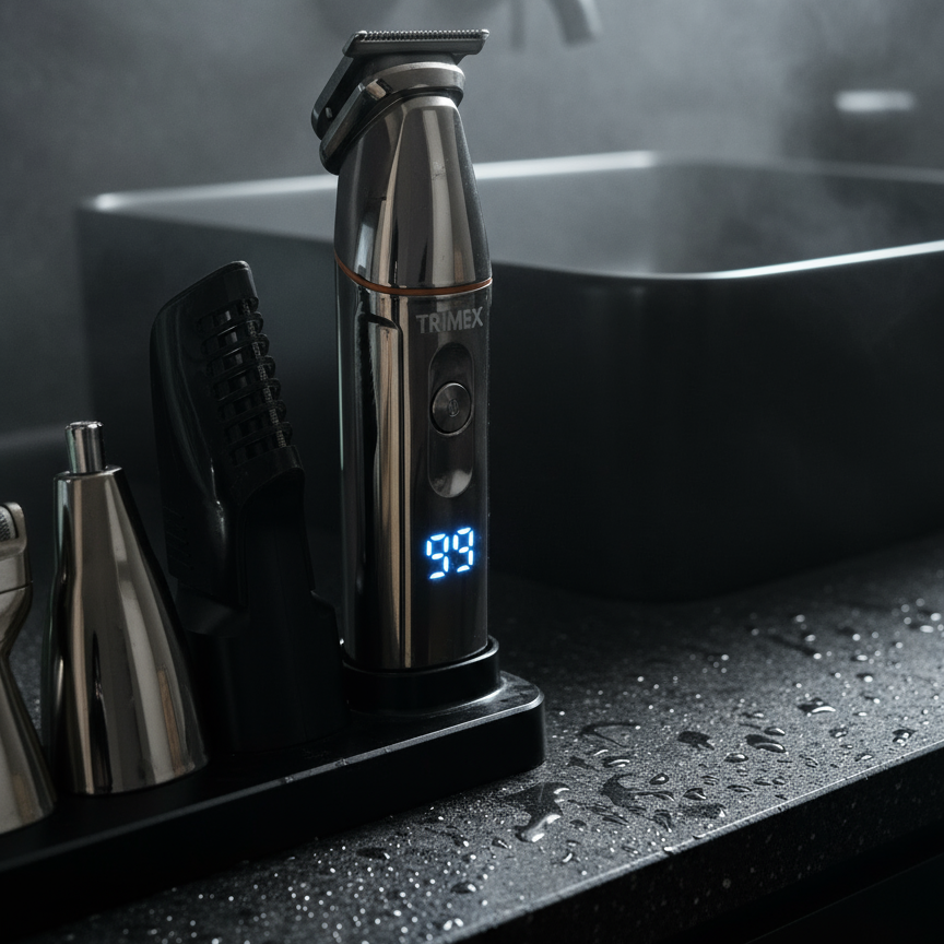 TRIMEX מחליפה 5 מכשירים שונים: תספורת, זקן, גילוח גוף, קווי פנים – וגם קוצץ לאוזניים ולאף. כל מה שצריך – בעיצוב אחד מרשים, מדויק ועמיד למים. בלי בלגן.